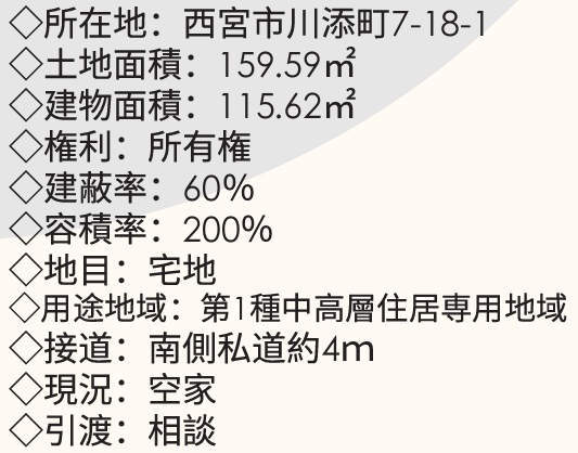 | 交通 | 阪神本線 香櫨園駅まで 徒歩13分 JR東海道線 さくら夙川駅まで 徒歩19分 阪急神戸線 夙川駅まで 徒歩25分 |