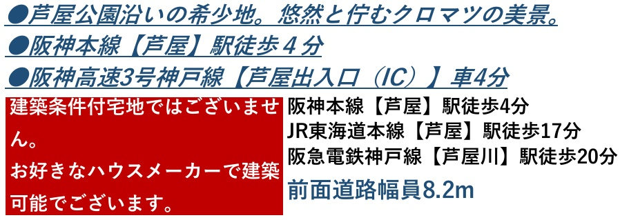 ◆阪神「芦屋駅」徒歩7分/JR「芦屋駅」徒歩22分/JR「芦屋駅」バス8分へ「芦屋公園テニスコート」バス停徒歩1分