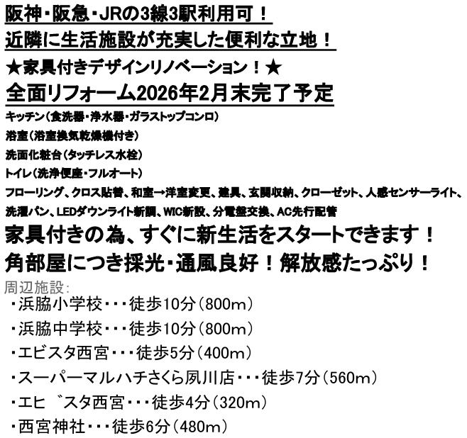 | 交通 | 阪神本線 西宮駅まで 徒歩3分 JR東海道線 さくら夙川駅まで 徒歩7分 阪急神戸線 夙川駅まで 徒歩13分 |