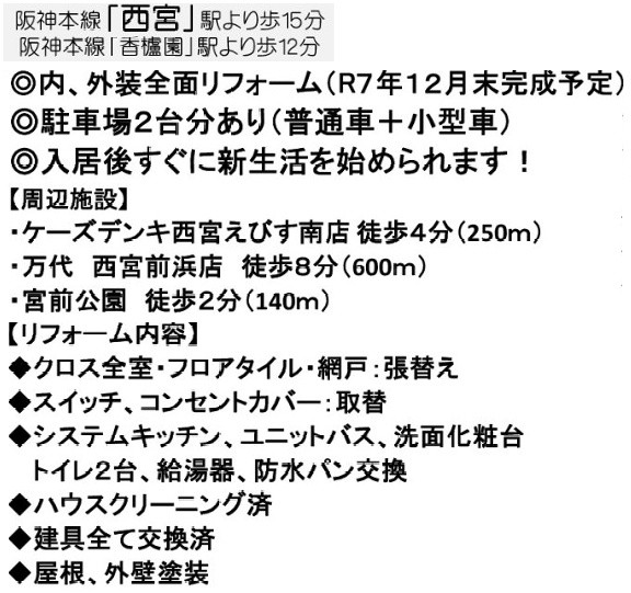 | 交通 | 阪神本線 西宮駅まで 徒歩12分 阪神本線 香櫨園駅まで 徒歩11分 JR東海道線 さくら夙川駅まで 徒歩17分 |