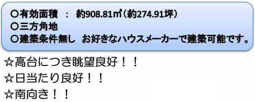 南向き、南ひな壇、陽当たり良好、眺望有り、更地、建築条件なし、3沿線利用可